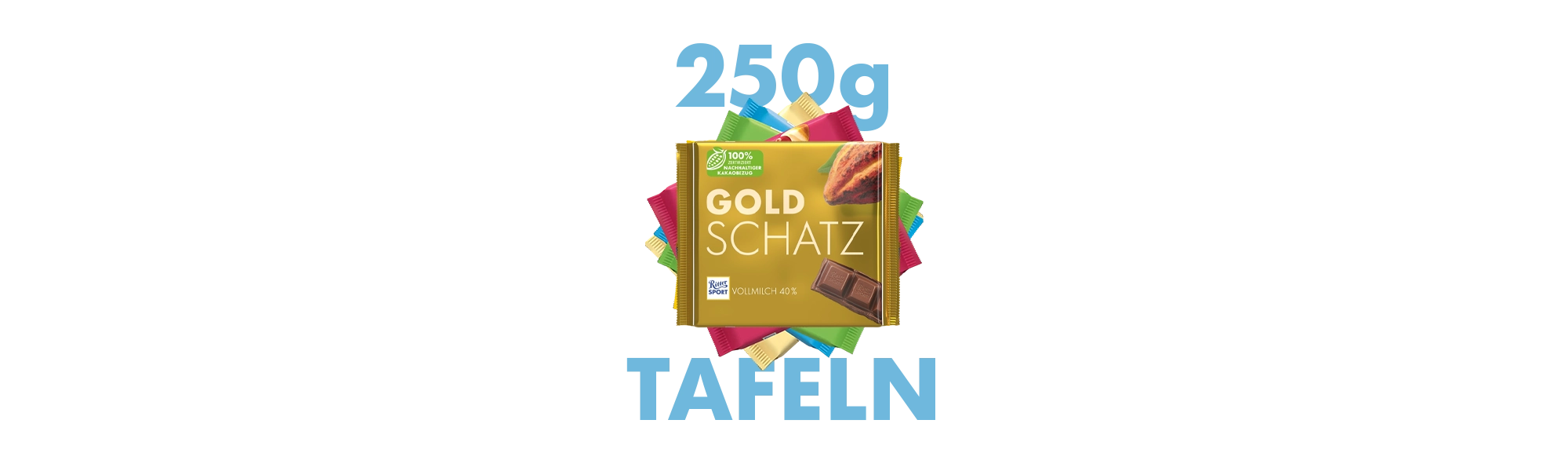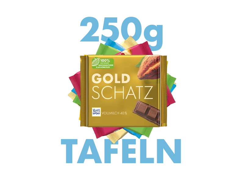 EIN EDLER KAKAOGENUSS. Lange bevor es Ritter Sport Schokolade gab, wurden Kakaobohnen als Zahlungsmittel verwendet. Spätestens wenn du unseren Ritter Sport Goldschatz gesehen und vor allem einmal probiert hast, weißt du auch warum: In dieser speziell conchierten Vollmilchschokolade mit edlem Trinitariokakao trifft kräftiger Kakaogeschmack auf eine feine Milchnote – ein einfach unbezahlbarer Genuss. Zutaten Vollmilchschokolade. Kakao: 40 % mindestens. Zucker, Kakaomasse, SAHNEpulver, Kakaobutter, MagerMILCHpulver, LAKTOSE, Emulgator: Lecithine (SOJA). Kann enthalten: Erdnüsse, Schalenfrüchte, glutenhaltiges Getreide, Ei. Durchschnittliche Nährwertangaben (pro 100g) Brennwert / Energie2366 kJ (569 kcal) Fett38g davon gesättigte Fettsäuren19g Kohlenhydrate46g davon Zucker44g Eiweiß7,6g Salz0,14g Weitere Informationen Nettofüllmenge: 250 g Grundpreis: 17,96 € / kg Mindestens haltbar bis: siehe Verpackung Kühl und trocken lagern. Hersteller: Alfred Ritter GmbH & Co. KG D-71111 Waldenbuch