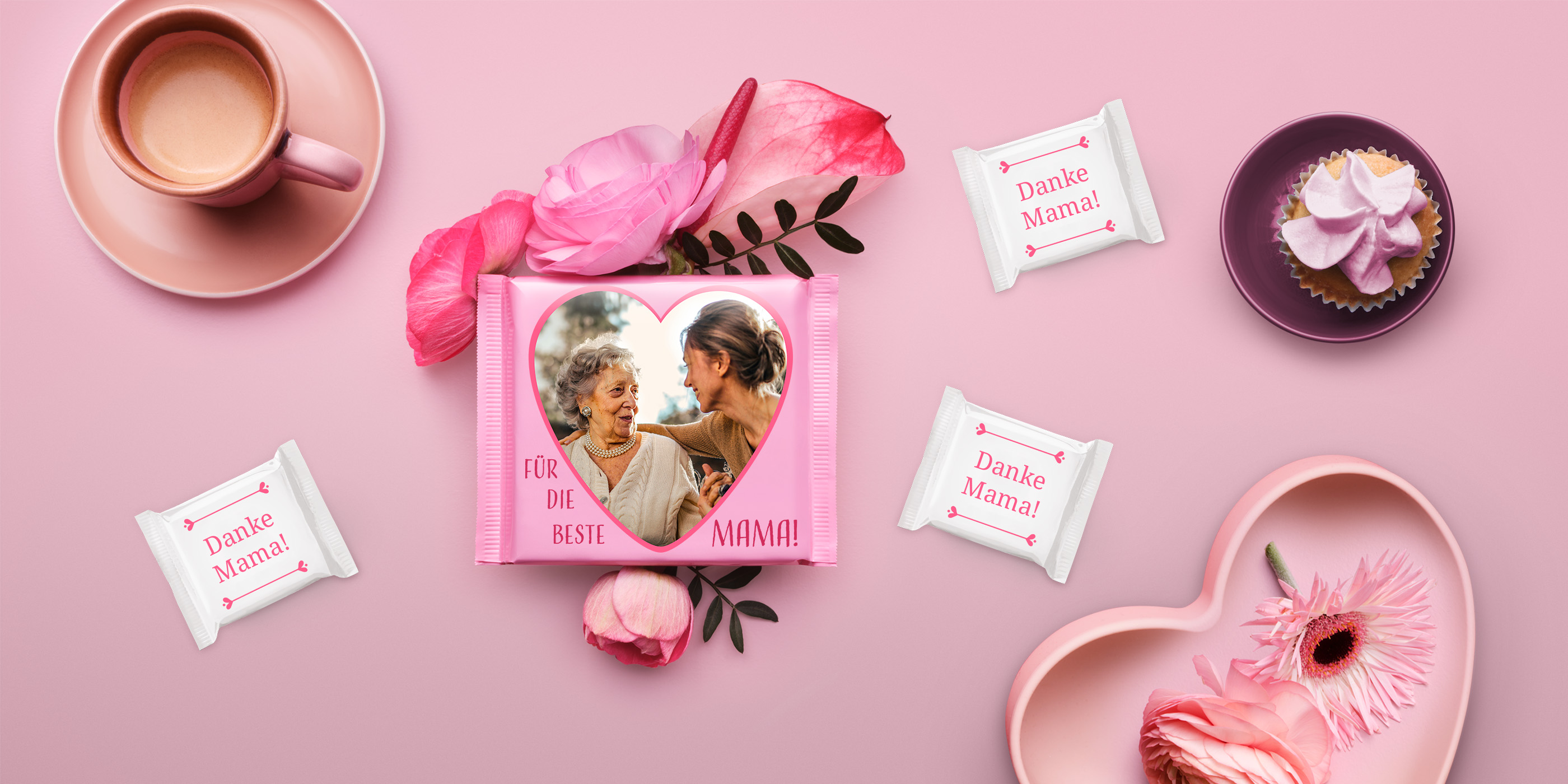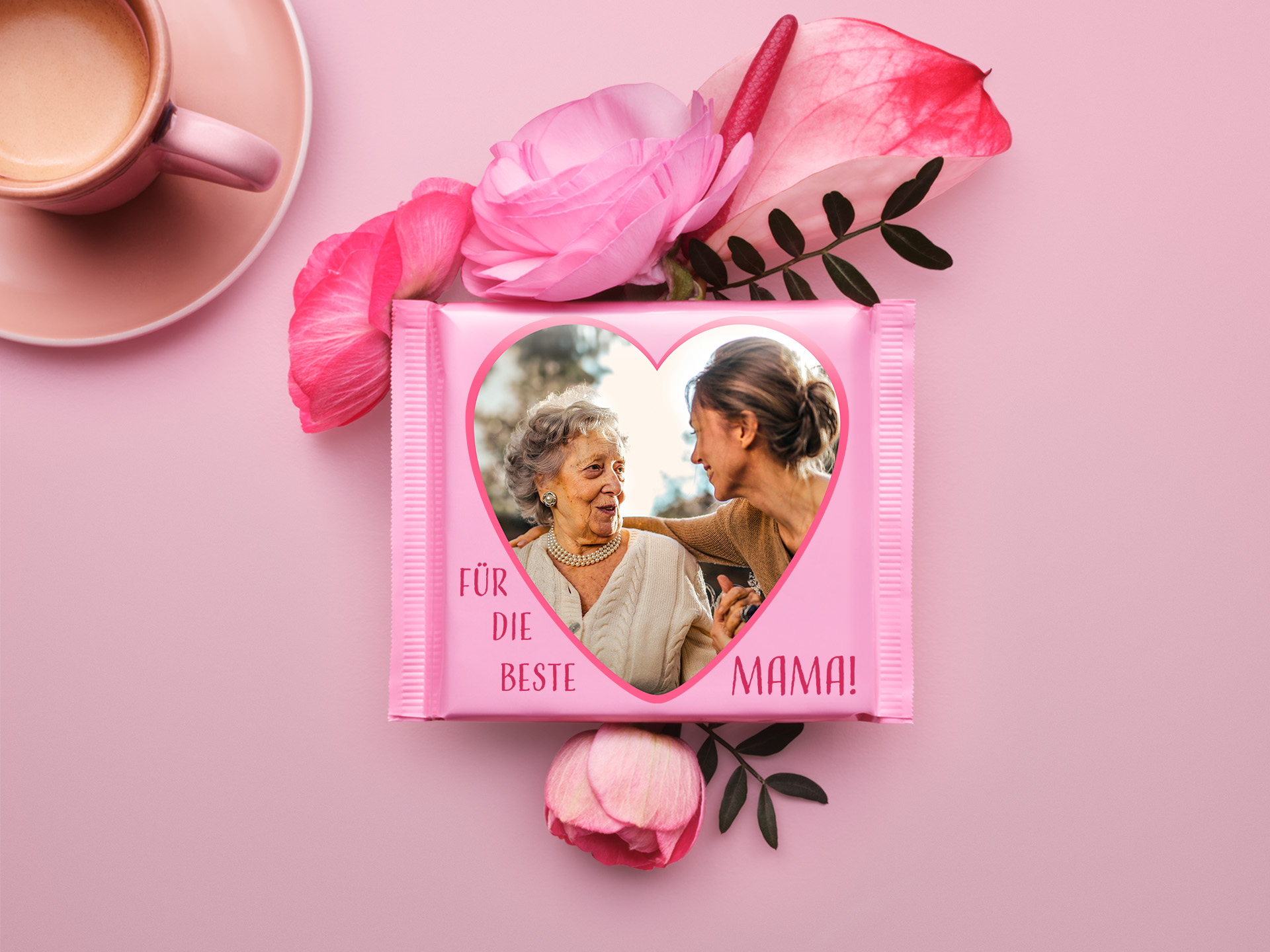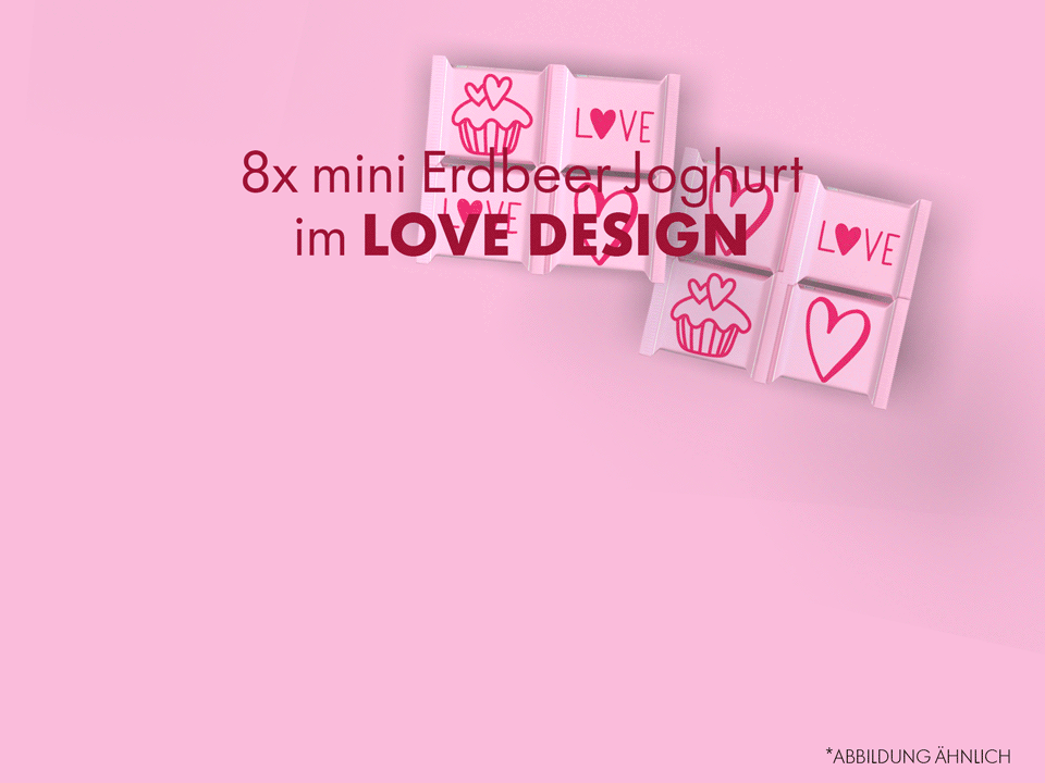 Gestalte Deine ganz persönliche 100g Tafel mit Deiner Botschaft oder Deinem Design und wähle beim Checkout die LOVE BOX als Geschenkverpackung dazu. Darin enthalten sind neben dem liebevollen Geschenkdesign 8 unserer Erdbeer Joghurt minis im LOVE Design. So wird aus Deiner ganz persönlichen Geschenktafel das perfekte Geschenk zu Muttertag!